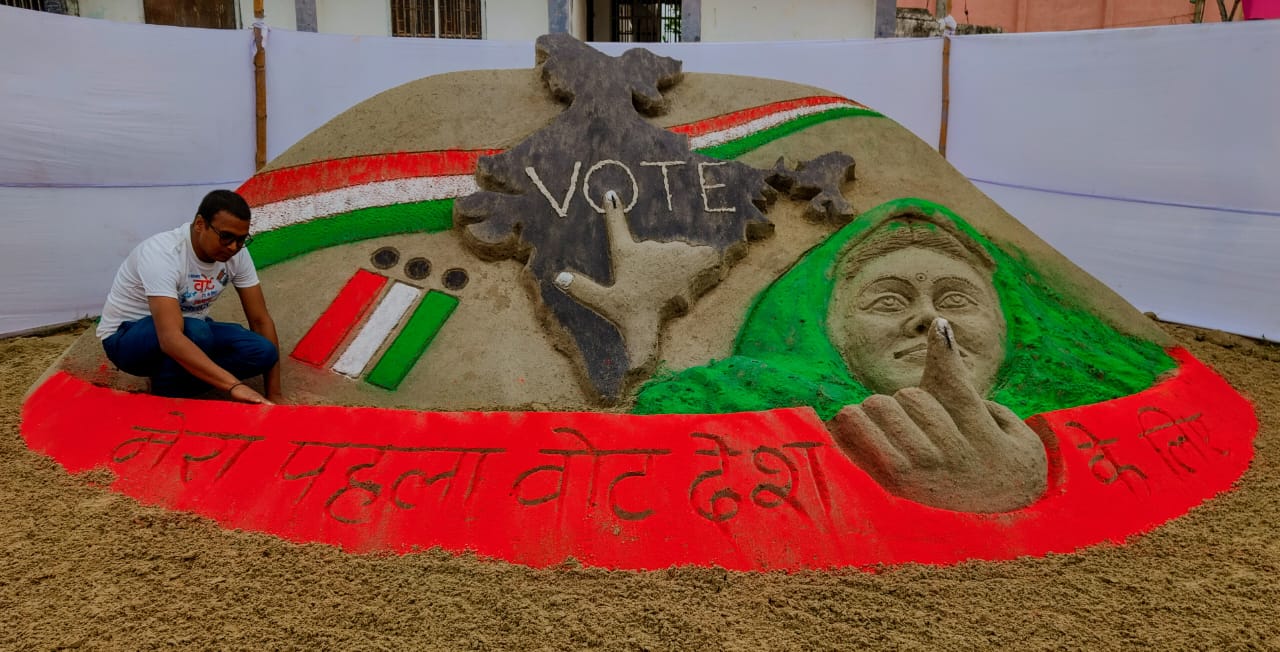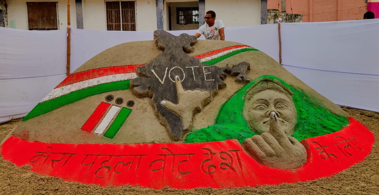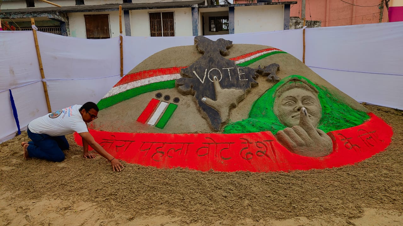 *सैंड आर्टिस्ट मधुरेंद्र ने युवा मतदाताओं को जागरूक करने के लिए रेत पर बनाई कलाकृति