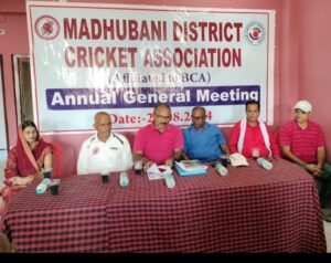 मधुबनी:- मधुबनी जिला क्रिकेट संघ की बार्षिक आमसभा की बैठक झा मेन्सन लहेरियागंज में जिला क्रिकेट संघ के अध्यक्ष श्री चण्डेश्वर मिश्र के अध्यक्षता में हुआ l बैठक में पिछले सत्र के आय व्यय की चर्चा तदर्थ समिति के चेयरमेन रहे श्री ओंकार नाथ झा ने विस्तार से किया l अध्यक्ष श्री चण्डेश्वर मिश्र के आदेशानुसार निबंधित क्लब और खिलाड़ियों के लिए नया सत्र 2024 – 25 में रजिस्ट्रेशन के लिए 5 सितम्बर 2024 से 21 सितम्बर 2024 तक रखा गया है, जबकि लीग क्रिकेट प्रतियोगिता छठ पूजा के बाद 10 नवंबर 2024 से शुरू किया जायेगा l बैठक में सर्व सम्मति से निर्णय लिया गया कि पिछले सत्र में प्रतिबंधित खिलाड़ी जो कारण बताओ सूचना का जवाब और माफीनामा जिला क्रिकेट संघ को दे चुके हैं को इस सत्र से प्रतिबंध मुक्त किया जाता है।